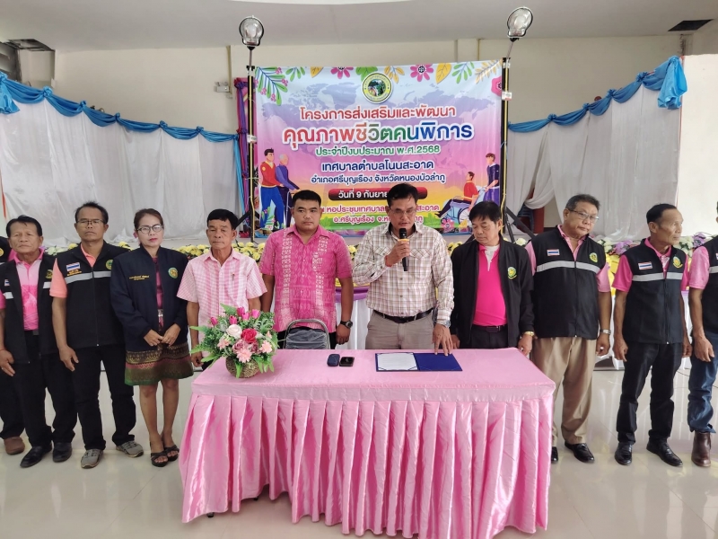วันที่9 กันยายน 2568 เวลา 09:30น. งานฝ่ายสวัสดิการและพัฒนาชุมชนจัดโครงการส่งเสริมและพัฒนาคุณภาพชีวิตคนพิการ ประจำปีงบประมาณ 2568 โดยนายสุริยันต์ มุ่งแสง นายกเทศมนตรีตำบลโนนสะอาด เป็นประธานเปิดโครงการ สิบตำรวจโทศราวุธ เชื้อไพบูลย์ ปลัดเทศบาลตำบลโนนสะอาด กล่าวรายงานโครงการ ณ หอประชุมเทศบาลตำบลโนนสะอาด